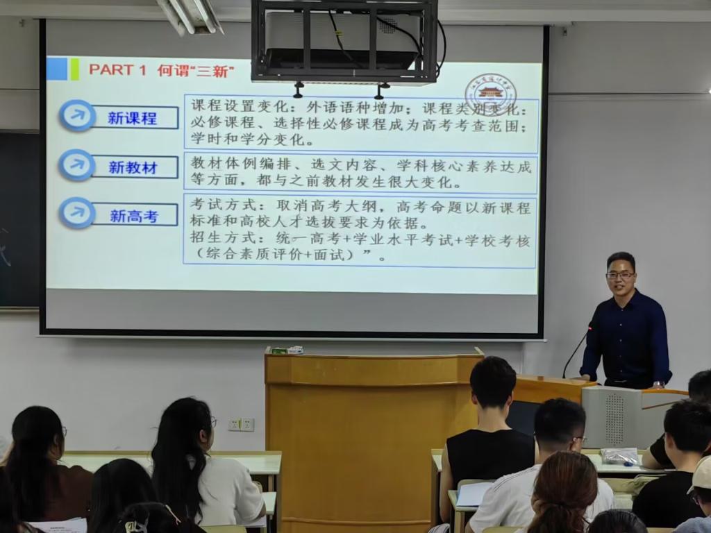 陈老师的讲座主要分五个部分。首先,阐释了“三新”概念,指的是新课程、新教材、新高考,陈老师向同学们分析了现阶段中学课程设置、课程类别、学时和学分等方面的变化,指出中学语文教材在体例编排、选文内容、学科核心素养达成方面与之前教材的差异性,提醒师范生关注新高考已取消了高考大纲,开始以新课程标准和高校人才选拔要求为命题依据;其次,陈老师详细解读了“三新”对学生、对教师的要求,明确教师必须要更加重视学生学习的主体地位,要在情境中引导学生进行学习;再次,陈老师介绍了宿迁中学“融汇深学”实践教学模式,即主要通过自主研学、情景活学、融通用学、反思评学四个环节逐层递进,引导学生思维向纵深度变化,实现教学评一体化;最后,陈老师又用散文名篇《登泰山记》为例,展示语文课堂如何实施“融汇深学”教学模式,给同学们极大的启发与思考。