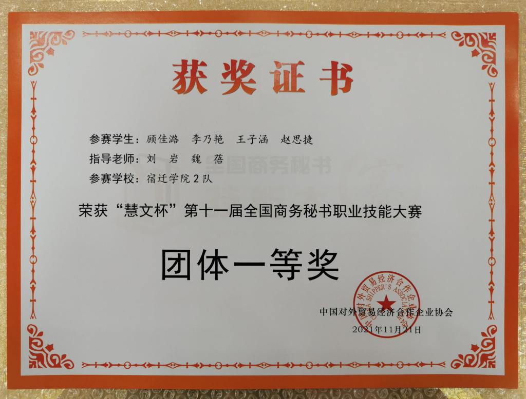 我院2019级汉语言文学专业8名学生组成2支代表队,与兄弟院校的选手们同台竞技。在长达5小时的比赛中,参赛选手进行了秘书综合事务处理、秘书工作情景展示、实境秘书工作处理等项目的比拼。最终,由顾佳潞、李乃艳、王子涵、赵思捷组成的宿迁学院2队荣获团体一等奖,由周梦、王治凡、李翊语、尹君强组成的宿迁学院1队荣获团体三等奖。周梦和赵思捷还分别获得大赛案例征集个人三等奖。