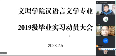 为推进本科生专业校外实习工作的顺利开展,使同学们更加明确实习任务和要求,提升学生职业素养和技能。2023年2月5日,我院文秘系召开2019级汉语言文学专业本科生实习动员线上大会。系主任付春明老师、副主任刘万华老师、实习指导教师张冉老师、李卫军老师、马艳艳老师、刘岩老师、辅导员王寅老师以及2019级全部学生参加了本次大会。会议由副主任刘万华主持。