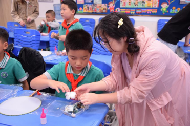 在活动正式开始前,文理学院师范生志愿者们向小朋友们介绍团扇的历史,带小朋友们欣赏从古至今尽显东方美学的精巧团扇工艺。在小朋友们的连连赞叹声中,老师将活动中要制作的材料包分发到孩子们手中,细致地为他们讲解手工团扇的制作方法以及注意事项。在老师的示范和志愿者的协助下,小朋友们用材料包中的干花材料,在扇面进行简单的构图及制作。现场不时传来小朋友们互相交流探讨后的笑声,气氛十分温馨、欢快。
