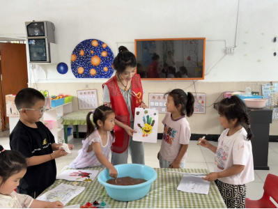 第二个活动是富有童趣的艺术创作环节——“手掌印画”的神秘旅程。志愿者老师用形象生动的语言引导孩子们观察手掌的形状,启发他们想象如何将手掌的轮廓变成各种奇妙的事物。孩子们迫不及待地拿起画笔,蘸上五彩的颜料,小小的掌印瞬间成为想象的画布:有的添上几笔化身为展翅的“火焰鸟”,有的变身成郁郁葱葱的“森林小手掌”……创作完成后,志愿者邀请孩子们上台分享自己的作品,每个孩子都自豪地念出魔法口诀:“我有一双神奇的手,它可以变成许多事物!”最后,志愿者老师将幼儿的作品晾干、收集,制作成一本独一无二的“神奇手掌绘本”,供孩子们日后欣赏回味,记录下这充满创意的美好时刻。