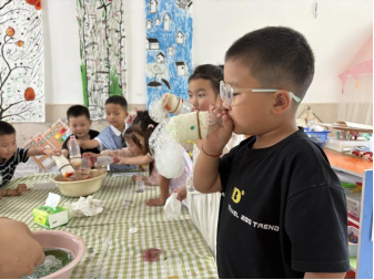 为了让孩子亲身体验创造的乐趣,志愿者鼓励孩子们两两一组动手操作。活动现场气氛热烈:有的孩子小心翼翼地蘸取溶液,有的鼓足腮帮子用力吹气。成功吹出“泡泡蛇”的孩子欢呼雀跃,迫不及待地与同伴分享成功的喜悦;暂时遇到困难的孩子也毫不气馁,在志愿者的耐心指导下,不断调整角度和力度,最终也绽放出成功的笑容,在实践中感受到科学的奇妙。