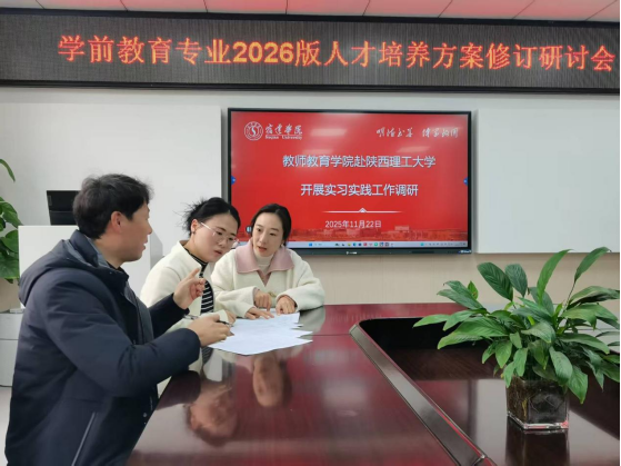 宿迁学院教师教育学院系主任李建英副教授带队,教授钱兵及系副主任刁力参会,带着学前教育专业优化需求,将“实践课程与岗位需求衔接”等实践育人关键问题作为调研重点,期望借鉴陕理工经验破瓶颈。陕理工教师教育学院院长袁书卷教授等出席,团队在实践课程设计等领域经验丰富,为调研提供支撑与案例。