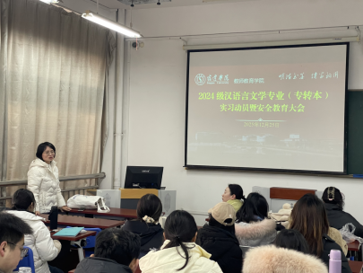 为扎实推进专业实践教学工作,明确实习任务与要求,2025年12月25日,我院24Z中文1班实习动员暨安全教育大会在2118教室召开。刘春华主任、王梅副主任和实习指导老师马宁出席会议,会议由王梅老师主持,24Z中文1班全体学生参会。