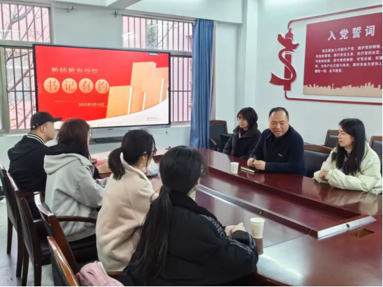 为深入了解学生成长需求,3月14日下午,教师教育学院党委副书记刘家豪主持开展"书记有约" 师生座谈会,与23中文2班周峻涛、24学前1班顾小月、24中文2班林新媛和24S中师班孟蕊四位学生代表围绕"倾听心声,共同成长"主题,就学业规划、校园生活及社团建设等议题展开交流。此次座谈会采用 "集中提问 + 自由研讨" 的形式,现场回应学生所关心的问题,为推进学院发展凝聚共识。