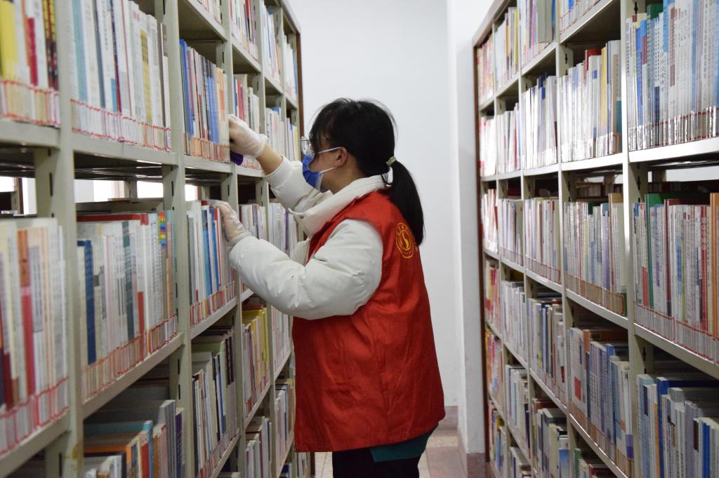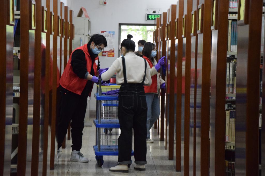 本次活动有“入馆疫情防控”“图书分类整理”“自修室秩序维持”“环境卫生维护”等志愿服务内容。志愿者们分四个小组,在图书馆老师的指导下在不同区域井然有序地开展工作。在一楼入馆处,志愿者礼貌地引导同学进出,提醒大家佩戴好口罩,做好防疫;自习室里,志愿者维护纪律,营造和谐的学习氛围;在书架旁,志愿者们整理图书、打扫卫生,彰显自身积极向上的精神风貌。