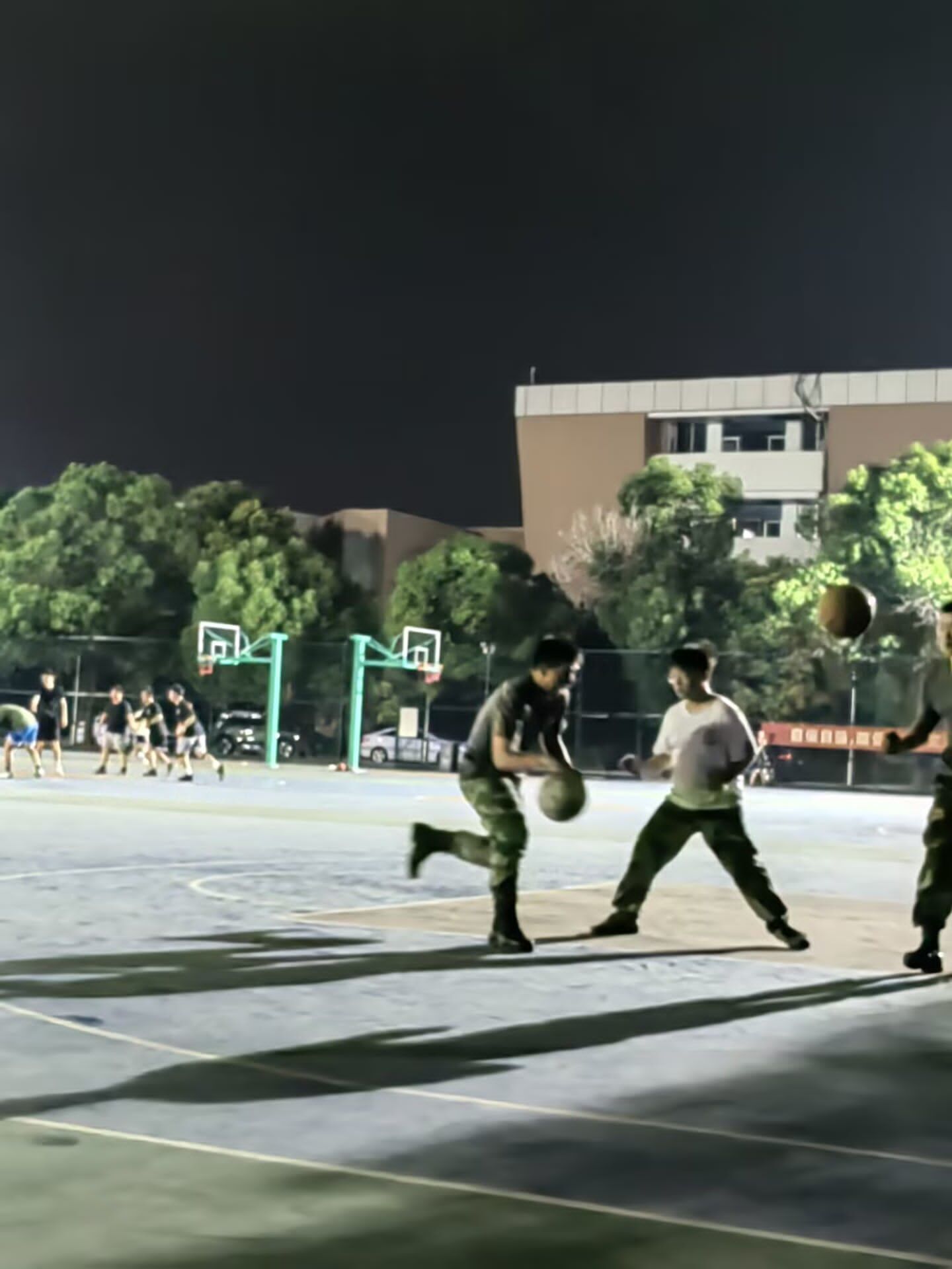在中场休息时,同学拿着放在一旁的篮球,独自操练了起来,三分,中投,上篮,一个个篮球的独特技巧展现在同学身上。在独自操练了一会后,教官也加入了。他们在休息的同学的注视下,开启了一对一单挑。同学的身高和体型跟教官比较来说,差距较大,但是同学并没有因此胆怯或者放弃,他不断的寻找突破的机会,尝试去突破教官的防守进行得分。但是教官防守严密,他没有办法得分,于是尝试中投,找准机会。“刷”的一声,篮球应声入网。在同学们的欢呼声中,教官和学生的篮球一对一逐渐进入了白热化阶段,最终以教官首先拿到11分结束比赛。
