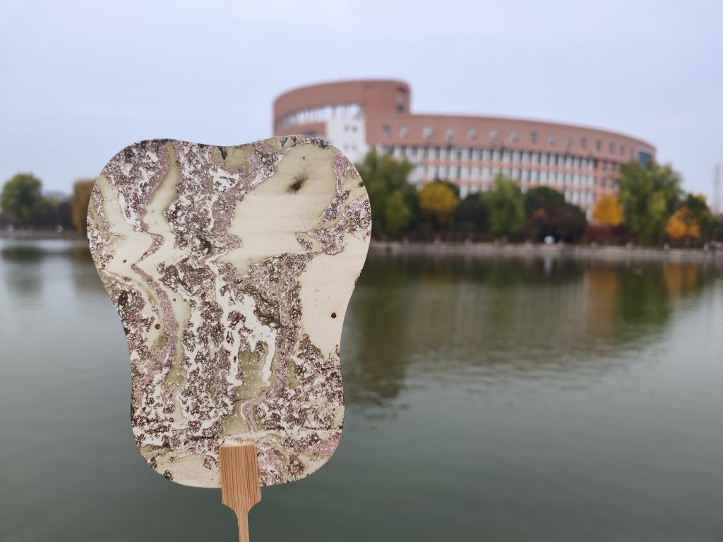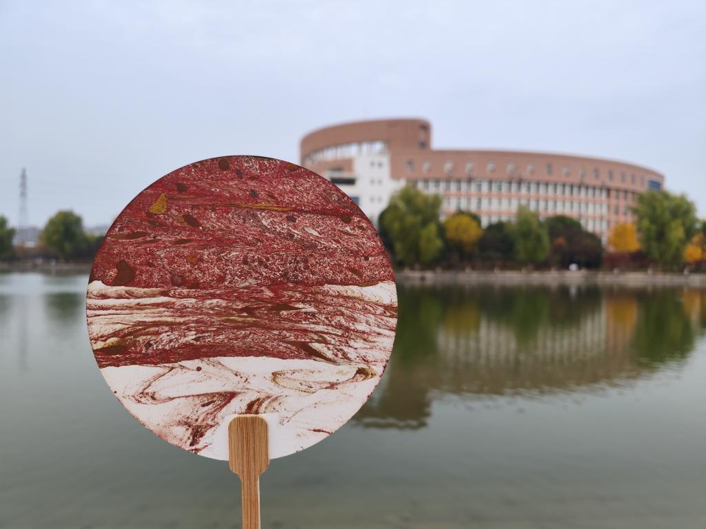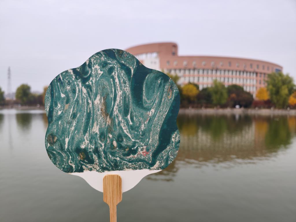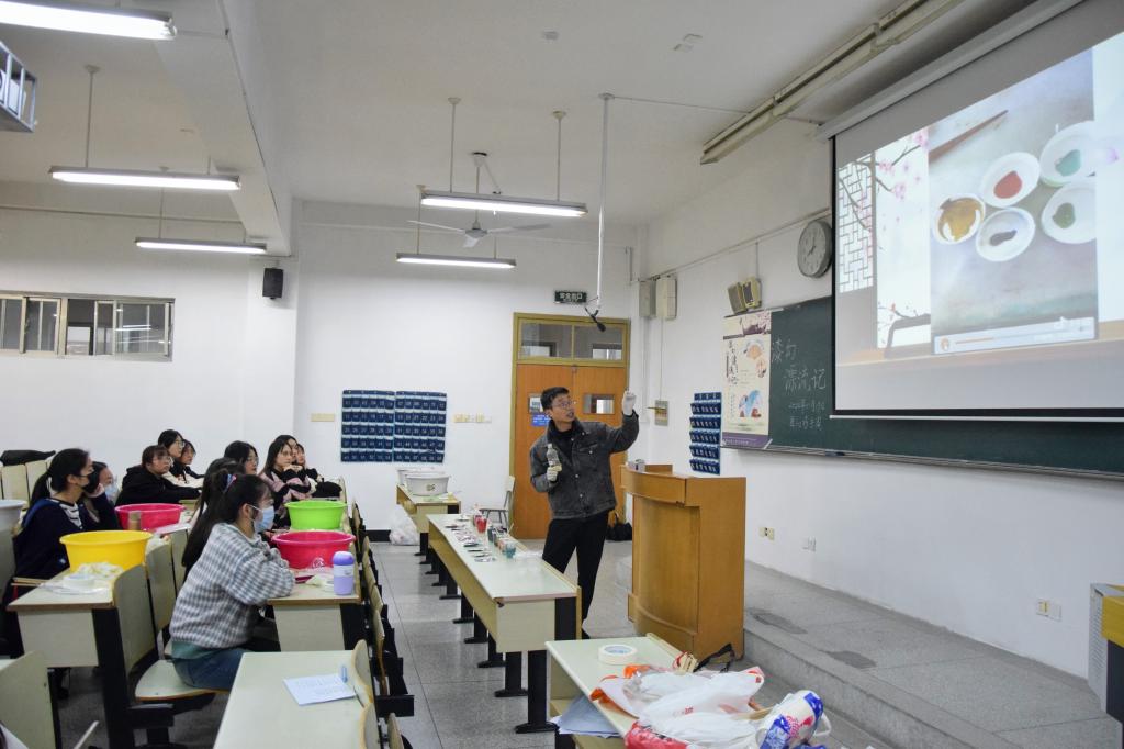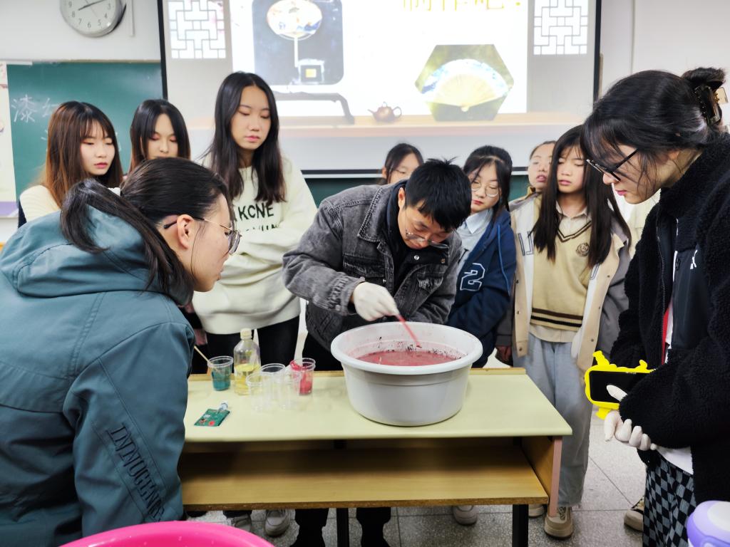 领略大漆前世今生,共鸣非遗古典之美。活动正式制作前,社团指导老师魏铭臣为同学们介绍了大漆的“前世今生”。通过展示漆画、漆器等漆艺作品,解读其中蕴含的东方美学,让大家更加深入地了解和鉴别漆艺。魏老师把非遗传承的落脚点回归到现实生活中,调动同学们对非遗古典美的共鸣,并手把手地传授调漆、漂漆团扇的制作技艺与手法。漂漆团扇五彩缤纷的颜色是一大亮点,将青色、蓝色、粉色等多种颜色,按照一定的配比并用松节油稀释,为后期制作做铺垫。