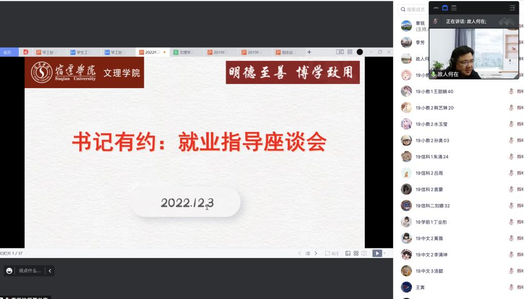 为了扎实推进2022届就业困难毕业生顺利就业,12月2日下午2:30,文理学院嵇会祥书记、季芳书记通过腾讯会议给24位建档立卡就业困难学生开展了就业帮扶指导讲座。三位毕业班辅导员参加了会议。