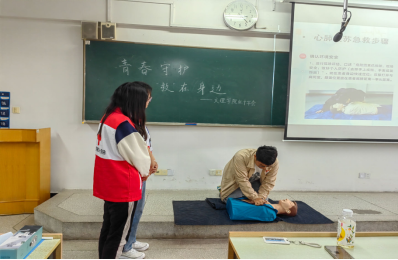急救实践锻本领。本环节的培训以理论知识讲授、技能实际操作相结合的方式,主要讲述心肺复苏等常见突发事件急救方法的基本操作。通过心肺复苏模型,就心肺复苏常见步骤进行了现场演练,结合具体操作分解讲述,对同学们的实践练习进行了指导。