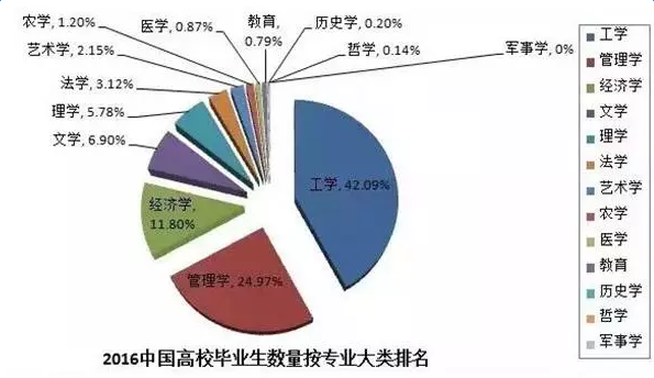 如下图所示,大数据显示,2016年中国高校毕业生按专业大类统计,42.09%的高校毕业生是工学类,接近半壁江山,其次是24.97%的高校毕业生是管理学类,11.80%的毕业生是经济学类,这三类合计占有78.86%。毕业生人数最少的三个专业大类是军事学、哲学、历史学。社会需要的人才概念也随着这一发展潮流而产生变化,掌握当今社会真正需要什么类型的大学生,对大学生以后就业大有裨益。