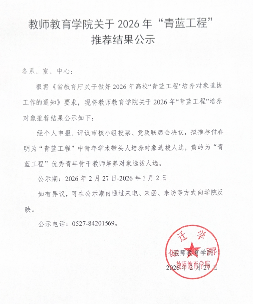 关于教师教育学院2026年“青蓝工程”推荐结果公示