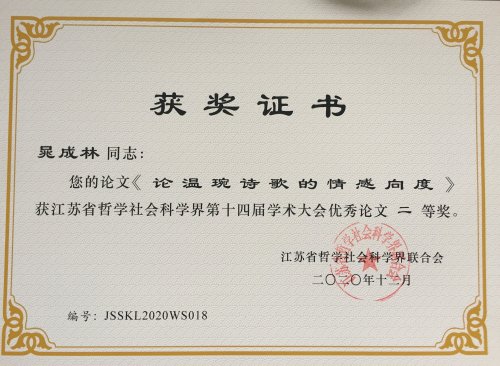 12月2日,江苏省哲学社会科学届第十四届学术大会“文学与历史学”专场在苏州大学举行,来自省内28所高校的的100余位学者参加了会议。文理学院中文系晁成林博士的论文《论温琬诗歌的情感向度》获得了二等奖。江苏省社科联副主席徐之顺、苏州大学副校长张晓宏在主席台上就坐,大会由苏州大学社科处处长于毓蓝主持。