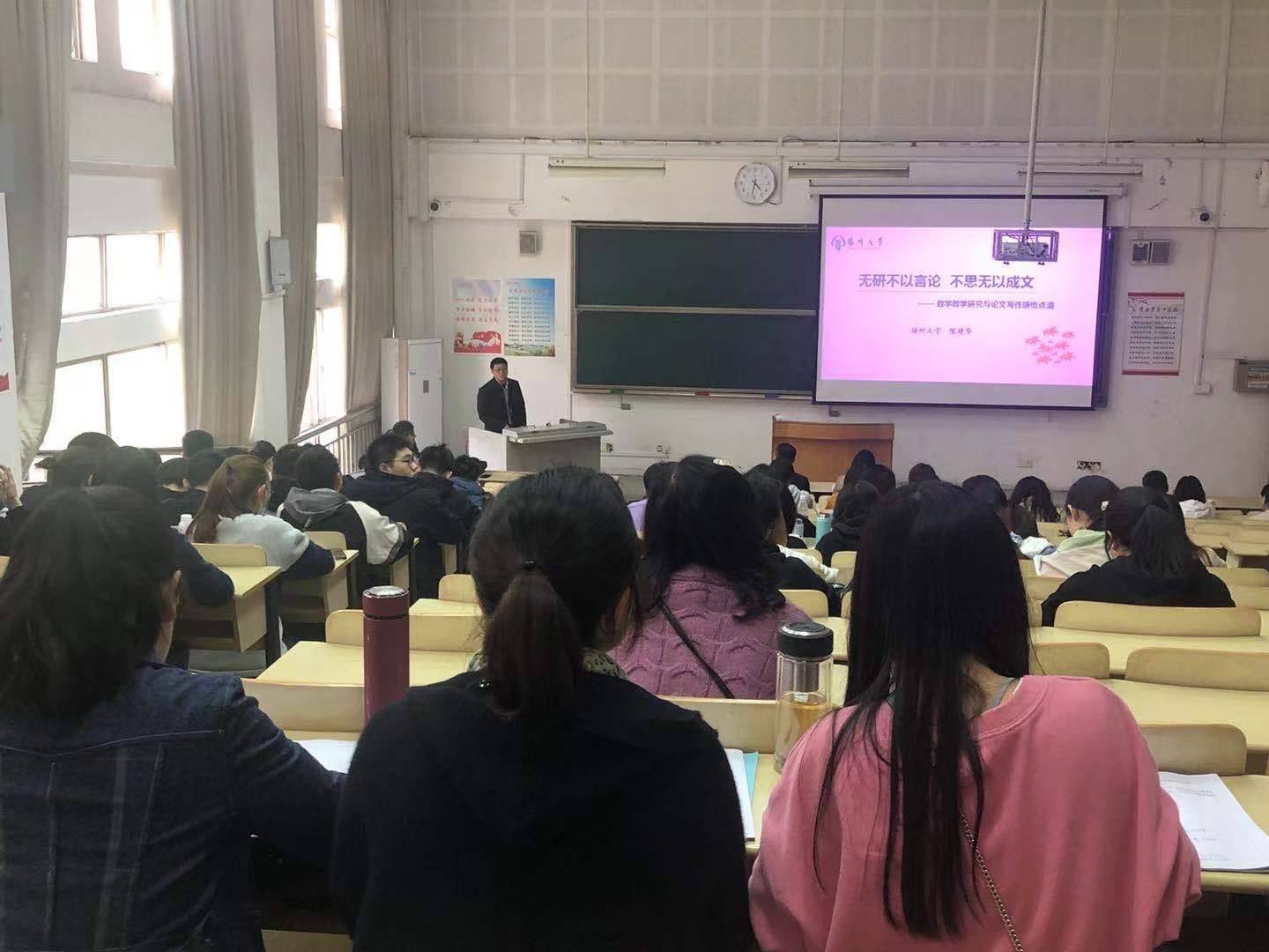 为了切实提高师生的教学研究能力,2021年4月16日下午,我院邀请扬州大学数学科学学院陈建华副教授于宿迁学院四号教学楼4101教室做了一场主题为《无研不以言论 不思无以成文———数学教学研究与论文写作感悟点滴》的专业学术讲座,参加讲座的有2018级数学专业学生、数学系全体教师。