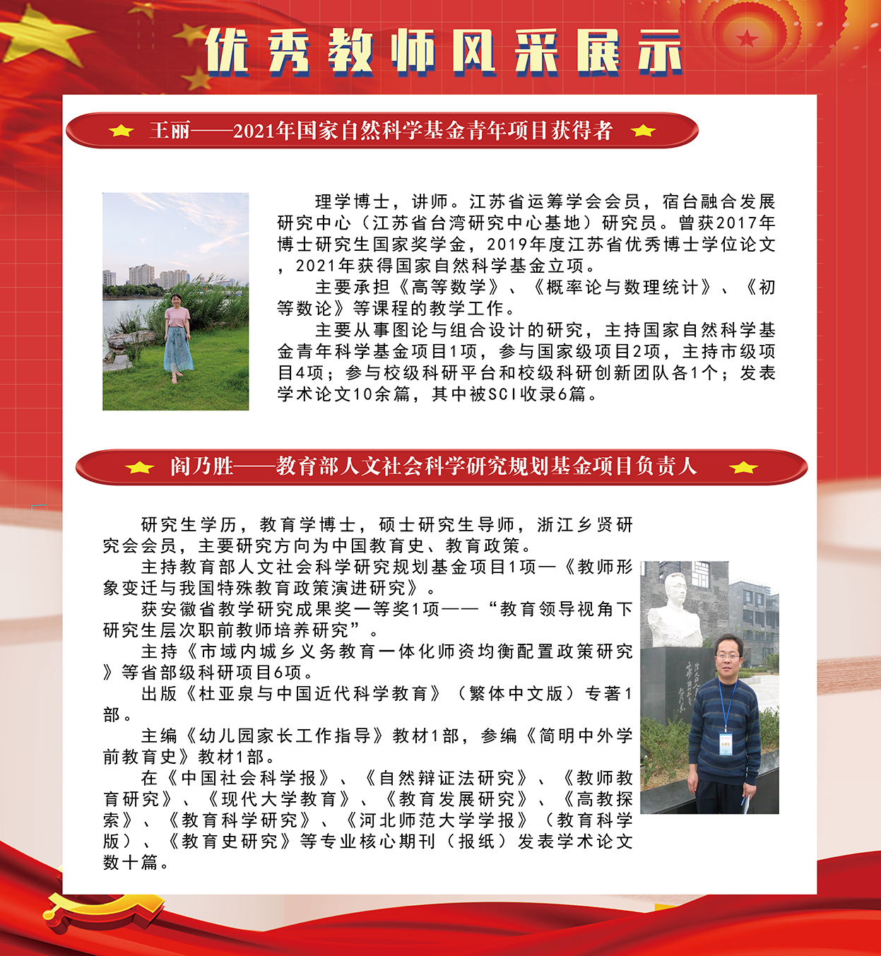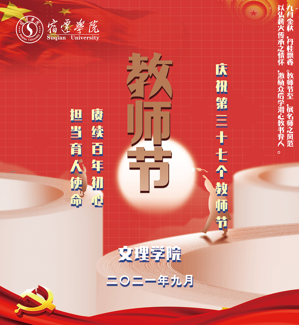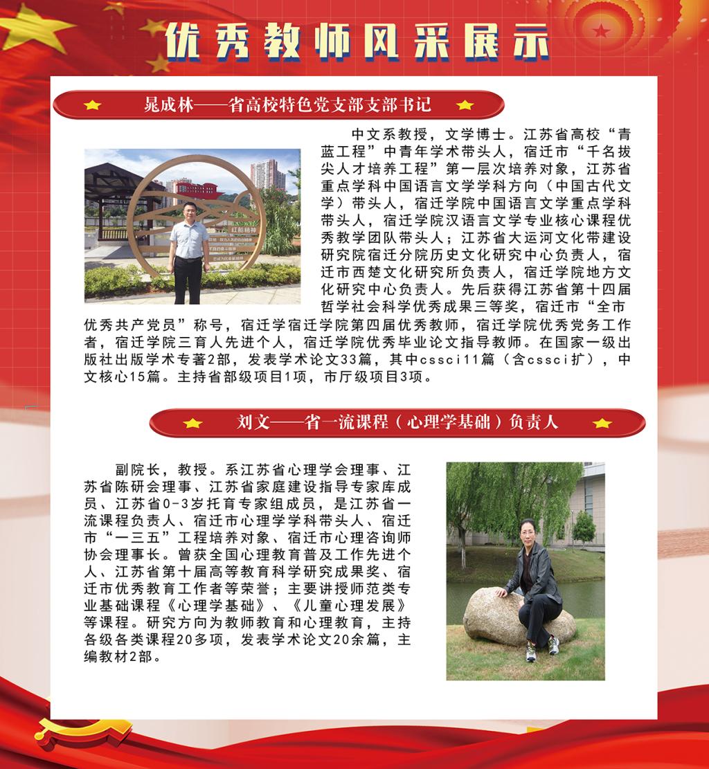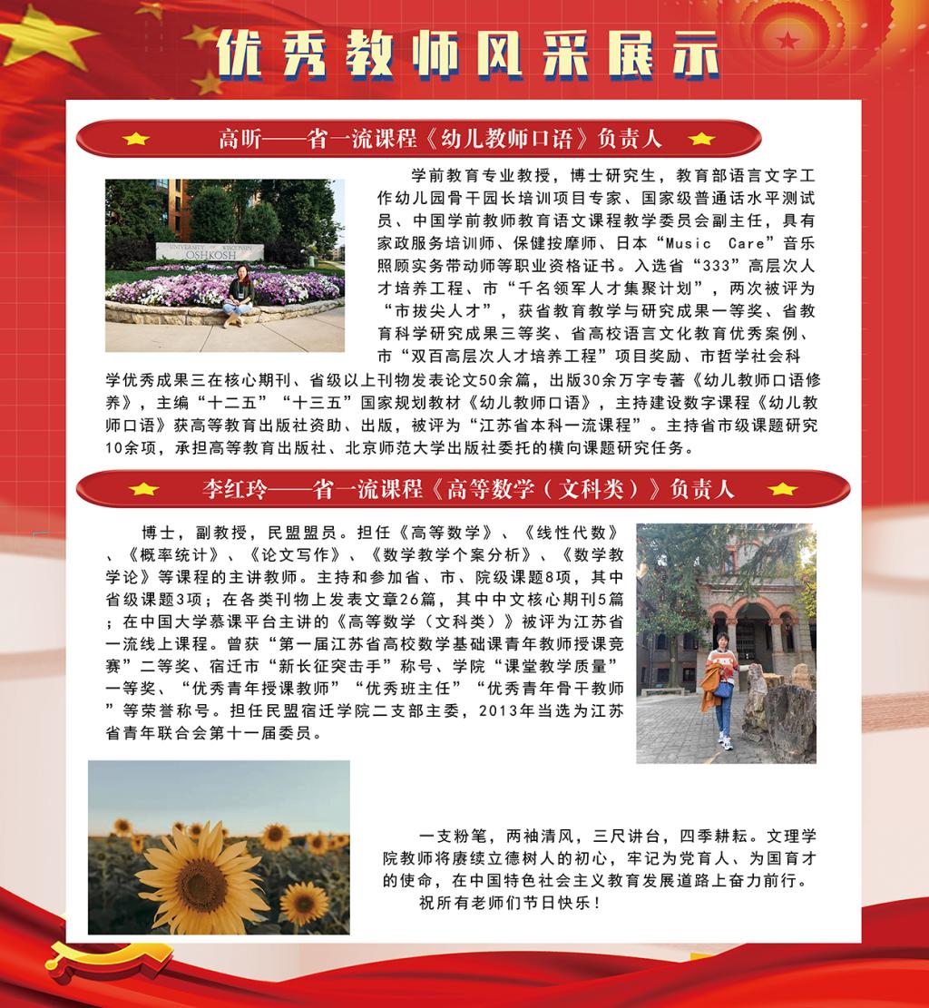 为庆祝第37个教师节,教育引导全体教师和师范生坚守教育初心、厚植教育情怀。我院将近年来在学科建设、专业建设、课程建设、教材建设、党支部建设等方面取得优秀成绩的老师进行集中展示,感召广大师生学习优秀教师的先进事迹,激发学生热爱教育的情怀,争做“大先生”。