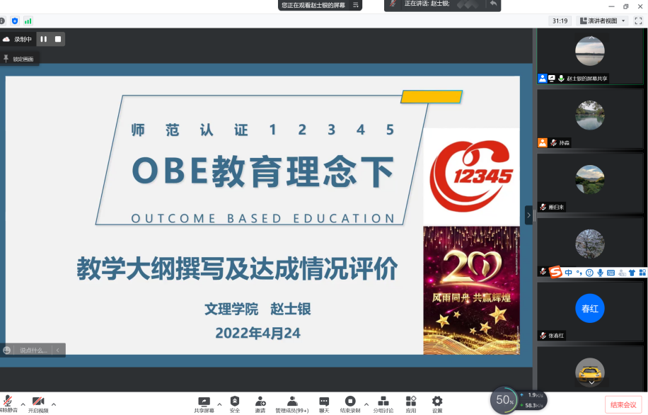 为了进一步提高教师教育能力,规范教学大纲以及课程目标达成情况分析的撰写,把OBE教育理念落实到各个重要教学环节。2022年4月24日下午,文理学院通过在线方式专题举办OBE教育理念教学沙龙。本次会议由赵士银副院长主讲,参会人员为全校师范专业专任教师。