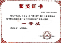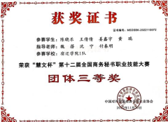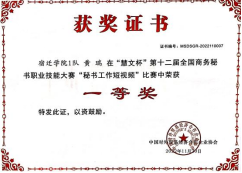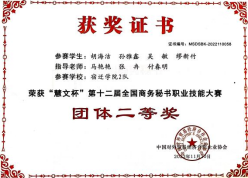 “慧文杯”第十二届全国商务秘书职业技能大赛于11月19日在南京隆重举行,经过激烈角逐,宿迁学院2队(胡海洁、孙雅鑫、吴敏、缪新竹)荣获本科组团体二等奖,宿迁学院1队(陈晓乐、王倩倩、姜鑫宇、黄瑞)荣获本科组团体三等奖。在个人赛中,黄瑞、胡海洁分别荣获一等奖,姜鑫宇、陈晓乐、王倩倩、孙雅鑫、吴敏分别荣获二等奖。