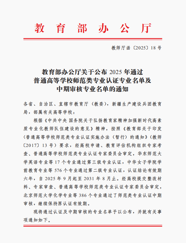 近日,教育部办公厅公布了2025年通过普通高等学校师范类专业认证及中期审核的专业名单,我院小学教育专业通过师范类专业小学教育第二级认证。