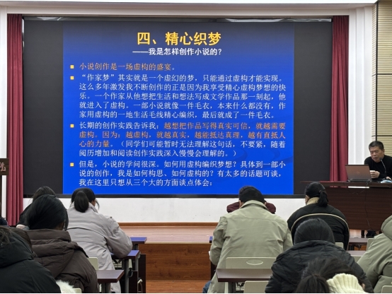 本次活动由宿迁学院教师教育学院主办,不仅是学校“聆湖大讲堂”系列学术活动的重要组成部分,也是教师教育学院深化专业建设、浓厚学术文化氛围的重要活动之一。本场讲座不仅搭建了中文系师生与知名作家面对面交流的宝贵平台,更通过一位本土文学名家扎根生活、执着追梦的真实故事,极大地激发了中文专业学子的专业热情与人生理想,对于营造校园浓郁人文氛围、培育高素质应用型文科人才具有重要意义。