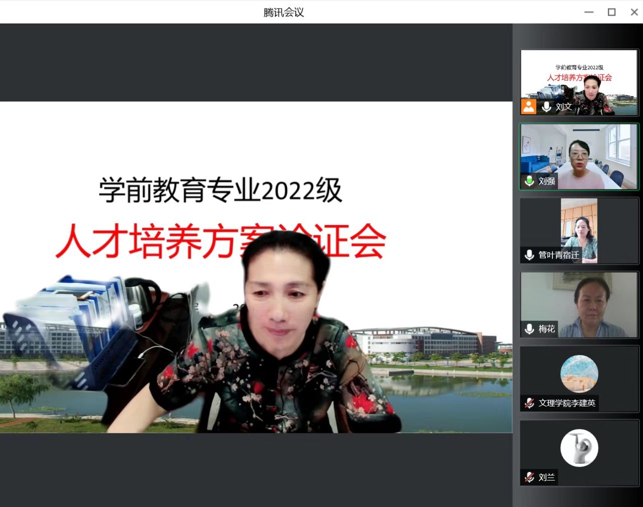 7月16日上午10时,文理学院学前教育专业召开2022级人才培养方案论证会。根据疫情防控要求,此次会议采用专家线上论证+教研室线下研讨的形式开展。盐城师范学院教育科学学院书记刘强教授、常州工学院人文学院副院长张建波教授、淮阴师范学院教育科学学院学前教育系主任夏如波副教授和宿迁市中小学教研室学前教育教研员管叶青主任作为特邀专家出席会议,会议由文理学院刘文教授主持,学前教育教研室李建英主任与本专业全体教师参加研讨。
