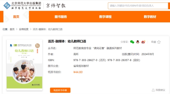 近日,教育部公示第二批“十四五”职业教育国家规划教材遴选结果。我院高昕教授主编的《幼儿教师口语(第3版)》成功入选。这是我院在教材建设领域取得的又一重要成果,更是学前专业人才培养质量的有力彰显。